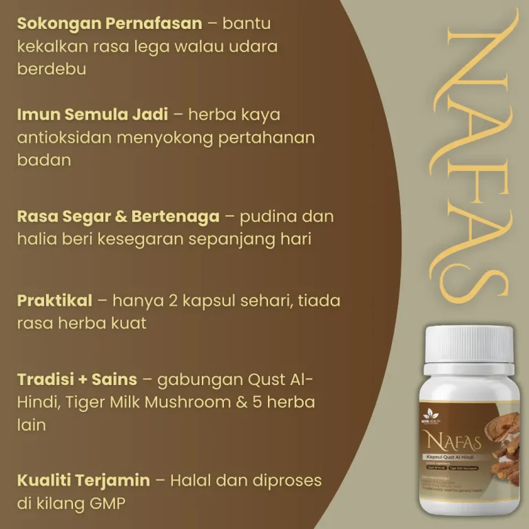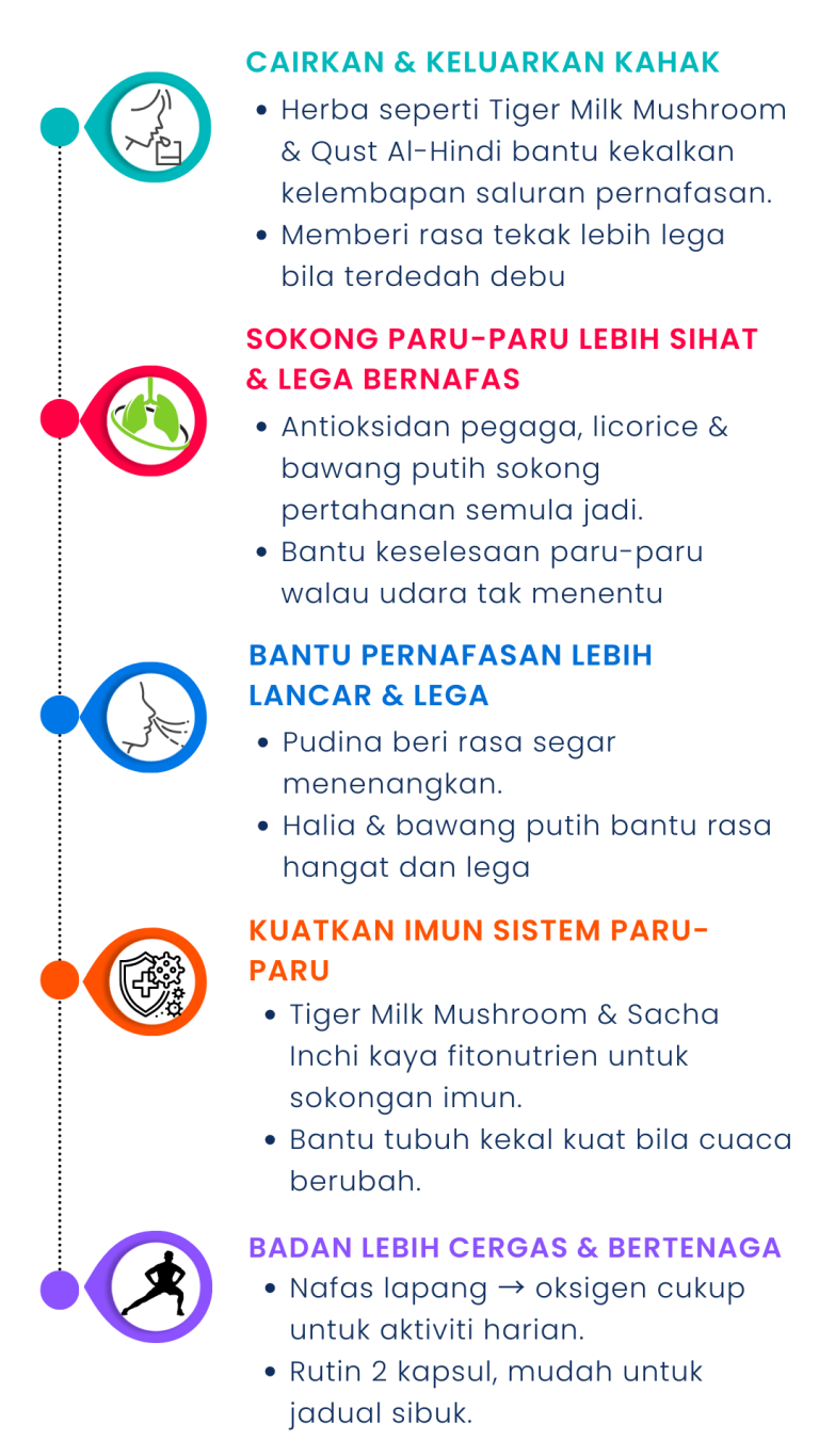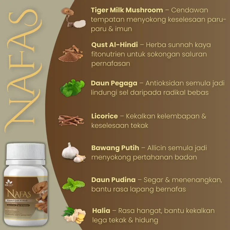 Formulasi Moden + Tradisi Qust Al-Hindi, Tiger Milk Mushroom & Herba Terpilih Sokongan Harian Untuk Nafas Lebih Selesa, Badan Bertenaga & Keselesaan Paru-Paru Sepanjang Hari