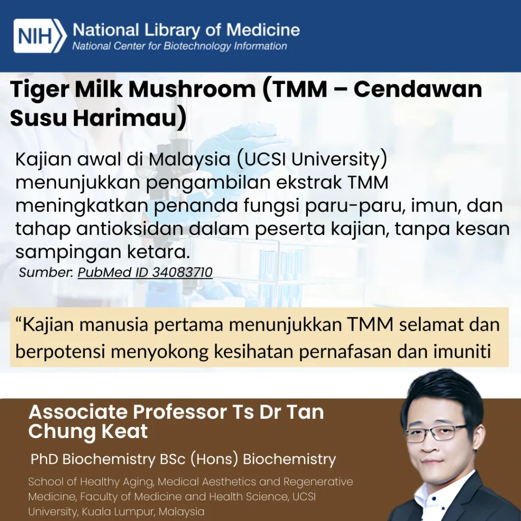 “Pengambilan Tiger Milk Mushroom (Lignosus rhinocerus) sebanyak 300 mg dua kali sehari selama 3 bulan mampu membantu memperbaiki kesihatan pernafasan dan daya tahan imun melalui penurunan gejala seperti batuk & kahak serta peningkatan kapasiti paru-paru dan tahap antioksidan dalaman” – Kajian klinikal oleh Dr. Eugenie Sin Sing Tan, Teik Kee Leo & Dr. Chung Keat Tan dari UCSI University – sumber PubMed