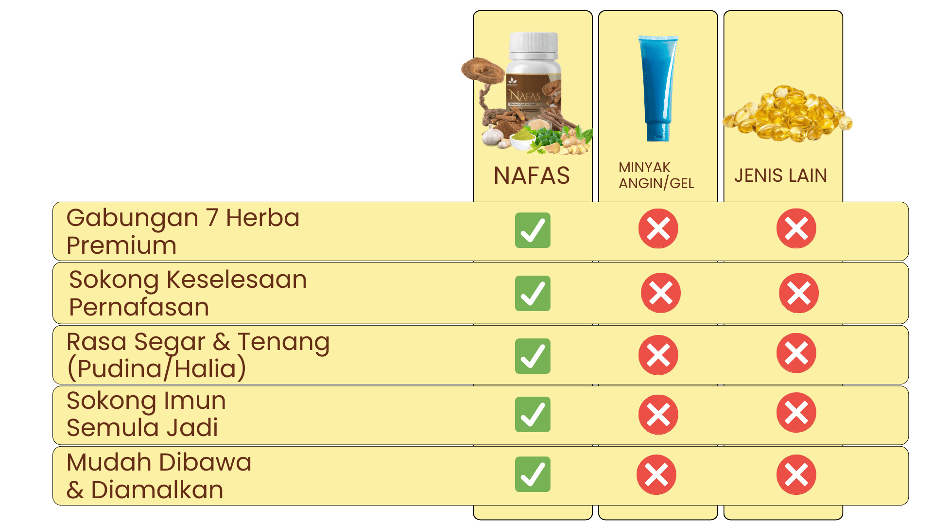 NAFAS gabungan 7 herba premium bantu rasa nafas lebih lega, tekak selesa, badan kekal bertenaga, minda lebih segar, tidur lebih nyenyak, dan buat anda rasa cergas sepanjang hari